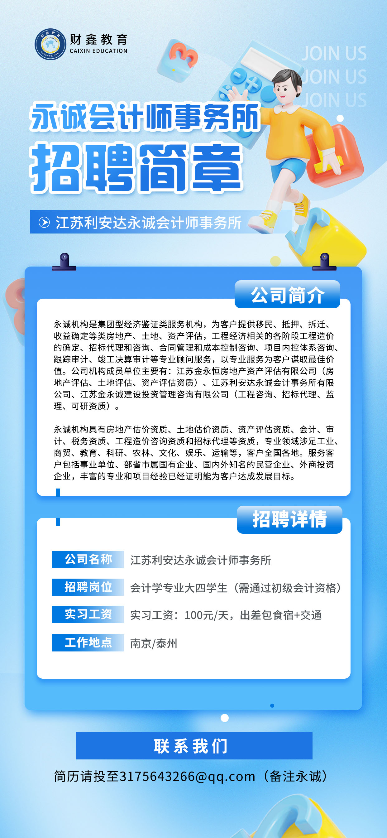 财鑫招聘 | 江苏利安达永诚会计师事务所招聘实习生