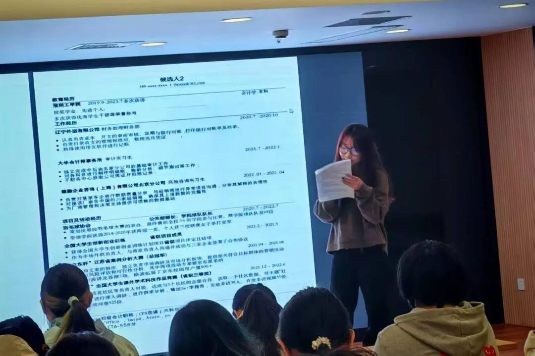 在稍后的座谈会上,刘老师和学生们亲切交流,对学生们的大学学习和生活给出了建议,并强调了CPA在未来工作中的作用。现场由财鑫项目老师带学生们做实训,让学生们从优秀简历中筛选出最适合进入中兴华的简历并说出理由。