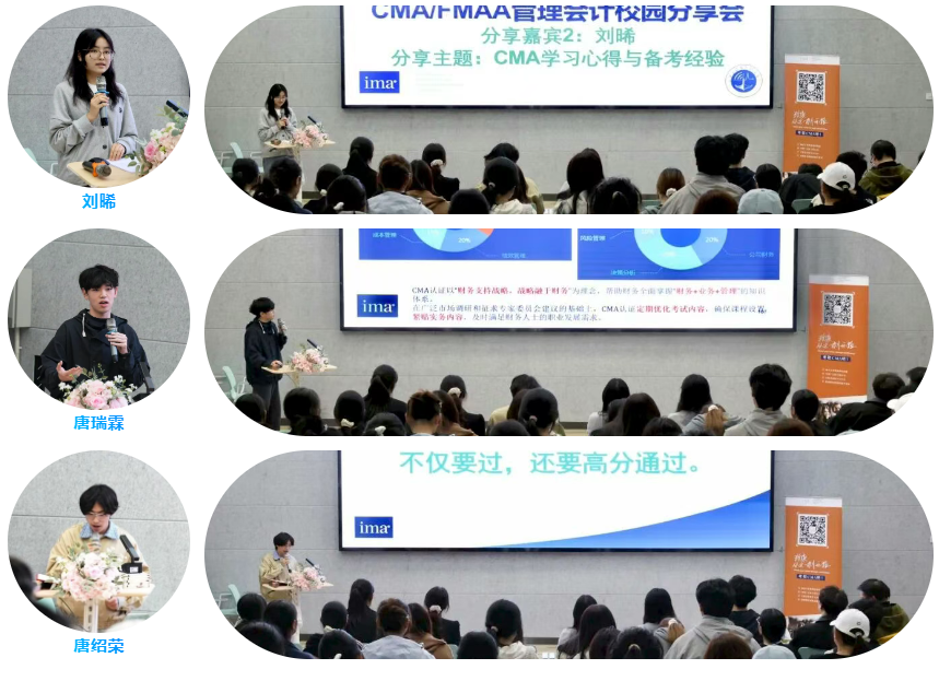 在考试经验分享环节,已通过CMA考试的优秀学生代表唐绍荣、唐瑞霖及刘晞同学,他们分别结合自身学习经历,从基础认知、备考方式等方面出发,交流了备考策略与学习心得。
