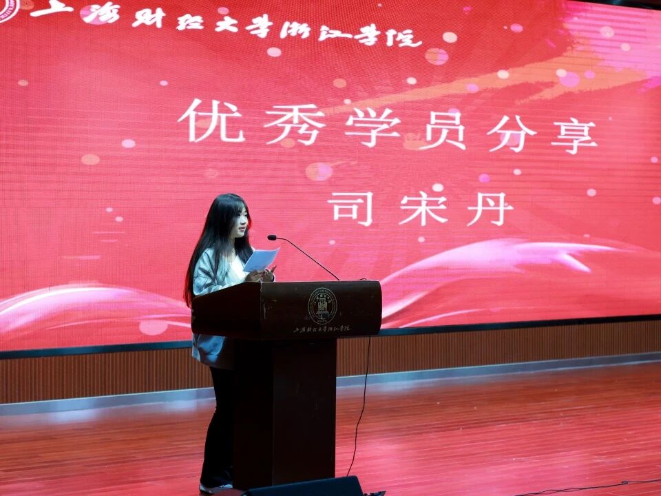 上海财经大学浙江学院CMA优秀学员代表,会计系25级学生司宋丹同学上台分享她的学习心得与感悟。她表示学习CMA是一种挑战,CMA的学习不仅丰富了自己的课余生活,更是帮助自己养成了利用时间的好习惯,学习是苦也是甜,付出了多少辛苦就会收获多少甜蜜,相信在不久的将来,可以收获更多的成绩。