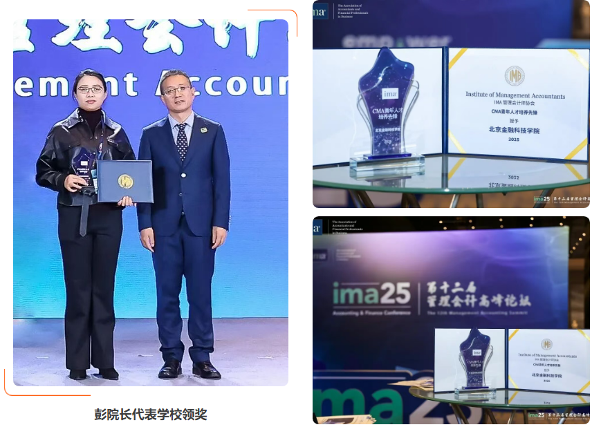 2025年11月14日,在IMA管理会计师协会举办的"第十二届管理会计高峰论坛"上,财鑫教育北京金融科技学院CMA荣获“CMA青年人才培养先锋”奖,财鑫教育北京金融科技学院CMA中心受邀出席,北京金融科技学院继续教育学院彭智杰院长代表学校上台领奖。