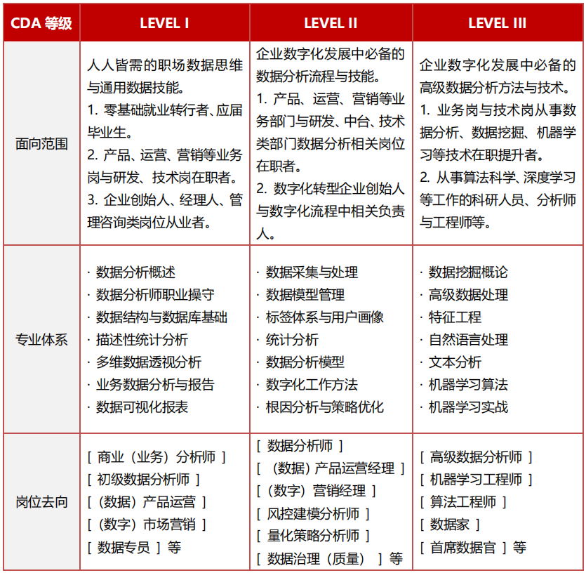 认证标准与内容满足各行业数字化发展中对数据相关岗位的人才要求,考试专家命题、评分公平、流程严格,具有高含金量。